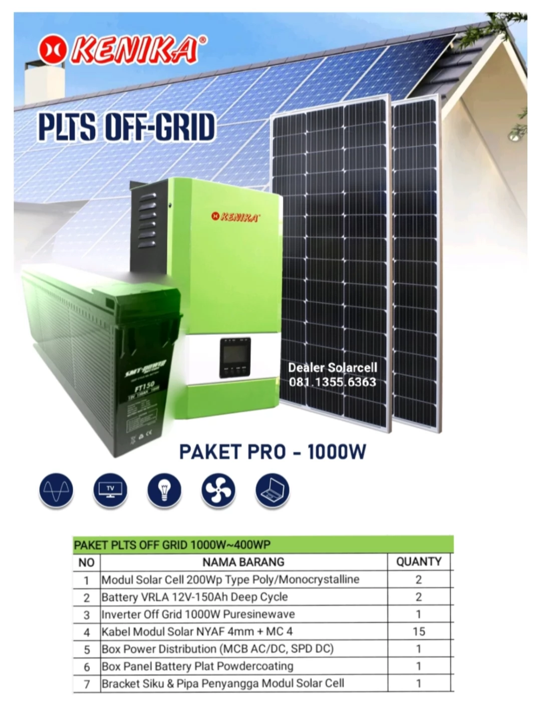 Kami menyediakan Paket PLTS Off Grid untuk kebutuhan power listrik rumah tangga mandiri skala menengah dengan backup battery tipe VRLA Deep Cycle. Cocok untuk perumahan dan perkantoran yang tidak ada sumber listrik PLN.