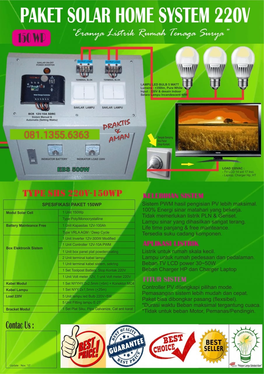 Shs Rumah 150wptipe 220v Menyediakan berbagai macam Lampu Penerangan Jalan Umum (PJU) Tenaga Surya atau Solar Cell dengan menyerap sinar matahari dijadikan arus listrik sebagai sumber listrik sehingga tanpa lagi menggunakan jaringan listrik PLN. Paket Lampu PJU Tenaga Surya Tipe Two In One dan All In One ini sangat cocok digunakan untuk jalan umum mulai ketinggian 5 s/d 9m diarea jalan perkotaan, pedesaan, pedalaman, pertambangan, pelabuhan, bandara udara dan komplek perumahan. Tipe lampu ini sudah menggunakan Battery tipe Lithium sehingga memiliki umur battery panjang sampai dengan maksimal 4 tahunan. Tipe lampu juga sudah menggunakan LED sehingga umur LED lampu panjang dan awet sampai dengan 5 tahunan.
